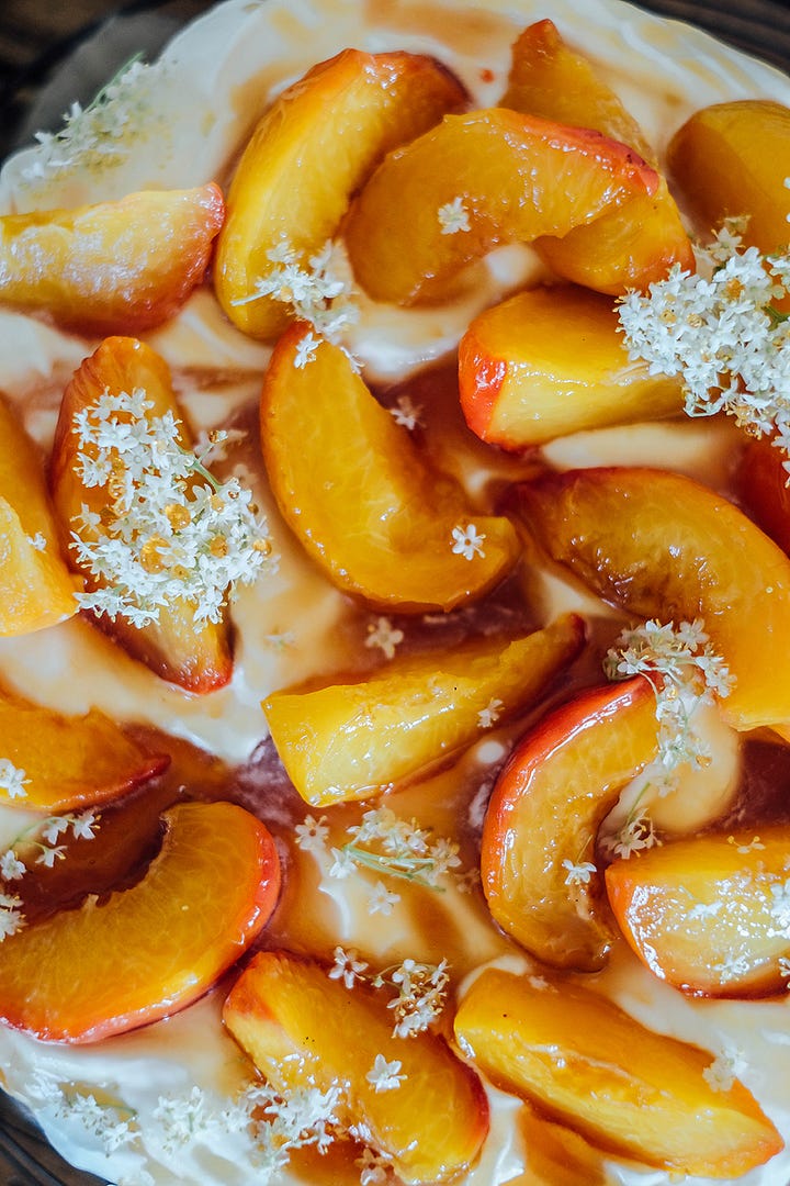 Walnut cake with poached peaches in elderflower syrup & mascarpone cream